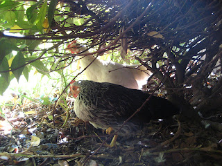 I started keeping chickens about a year and a half ago. A friend sent us a hen sitting on nine eggs. Seven hatched (16-17 May 2011); three were roosters. Today the mom-hen and one rooster are at the friend's house again, and the other two roos have been rehomed to a farm (it's more of a very large backyard) not too far away. This leaves me with the four hens who hatched from their eggs: